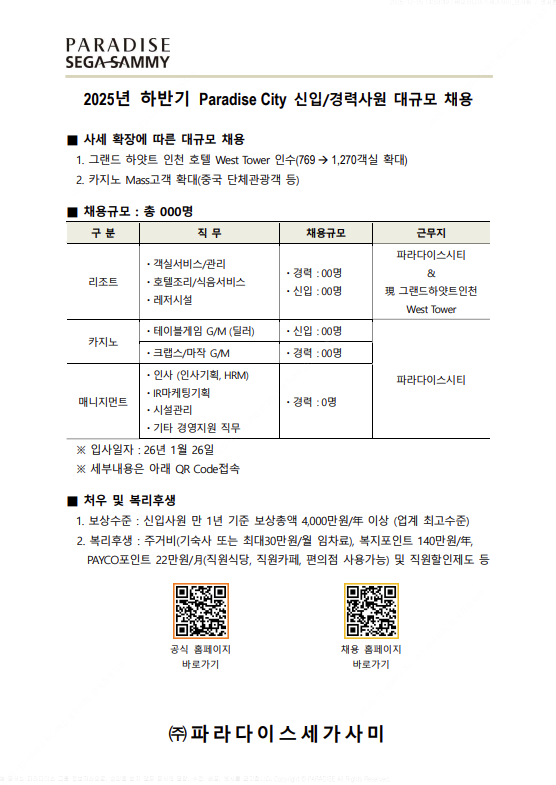[파라다이스세가사미] 현장 채용설명회 안내문